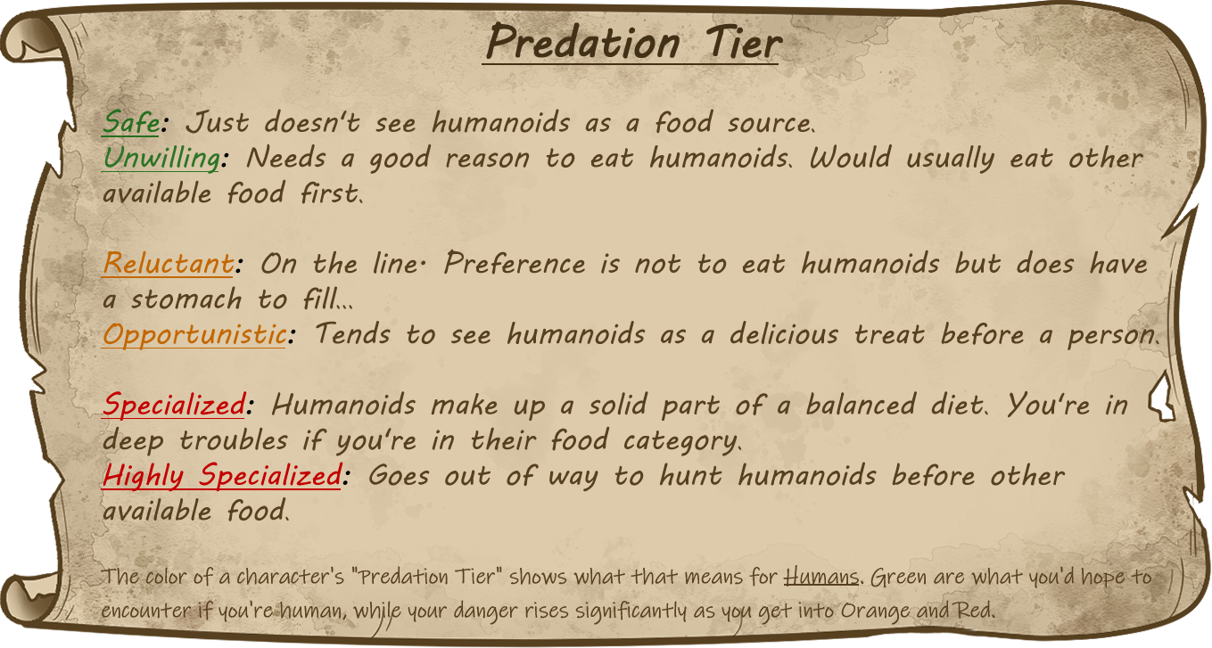 The color of a character's "Predation Tier" shows what that means for humans. Green are what you'd hope to encounter if you're human, while your danger rises significantly as you get into orange and red.
