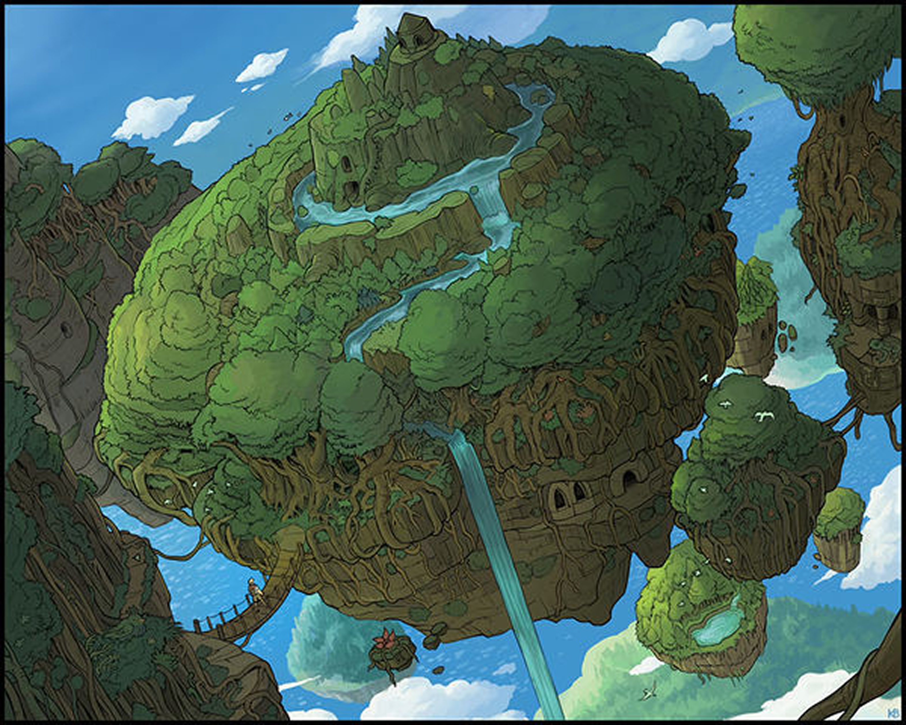 Most of the rocks composing the cloud are rather small and bare, but some of them are massive, the largest ones forming floating islands, covered in vegetation and possessing ecosystems of their own. The traces of an ancient civilization can be found across the cloud, with some remarkable structures carved out of the rocks themselves. They look primitive for the most part, with rough, uneven gates leading to simple rooms choked out by vegetation. However the deeper a visitor explore these structures, the stranger they become. Inner halls remain small but appear to have been dug with an uncanny precision in straight lines and lead to various rooms with similarly straight walls. Some of those chambers have their walls, floor and ceiling covered by a strange golden metal that look like gold but is much lighter and possesses different properties. It appears very hard to remove and extract though, as it seems to have been merged with the rock itself through an unknown process.