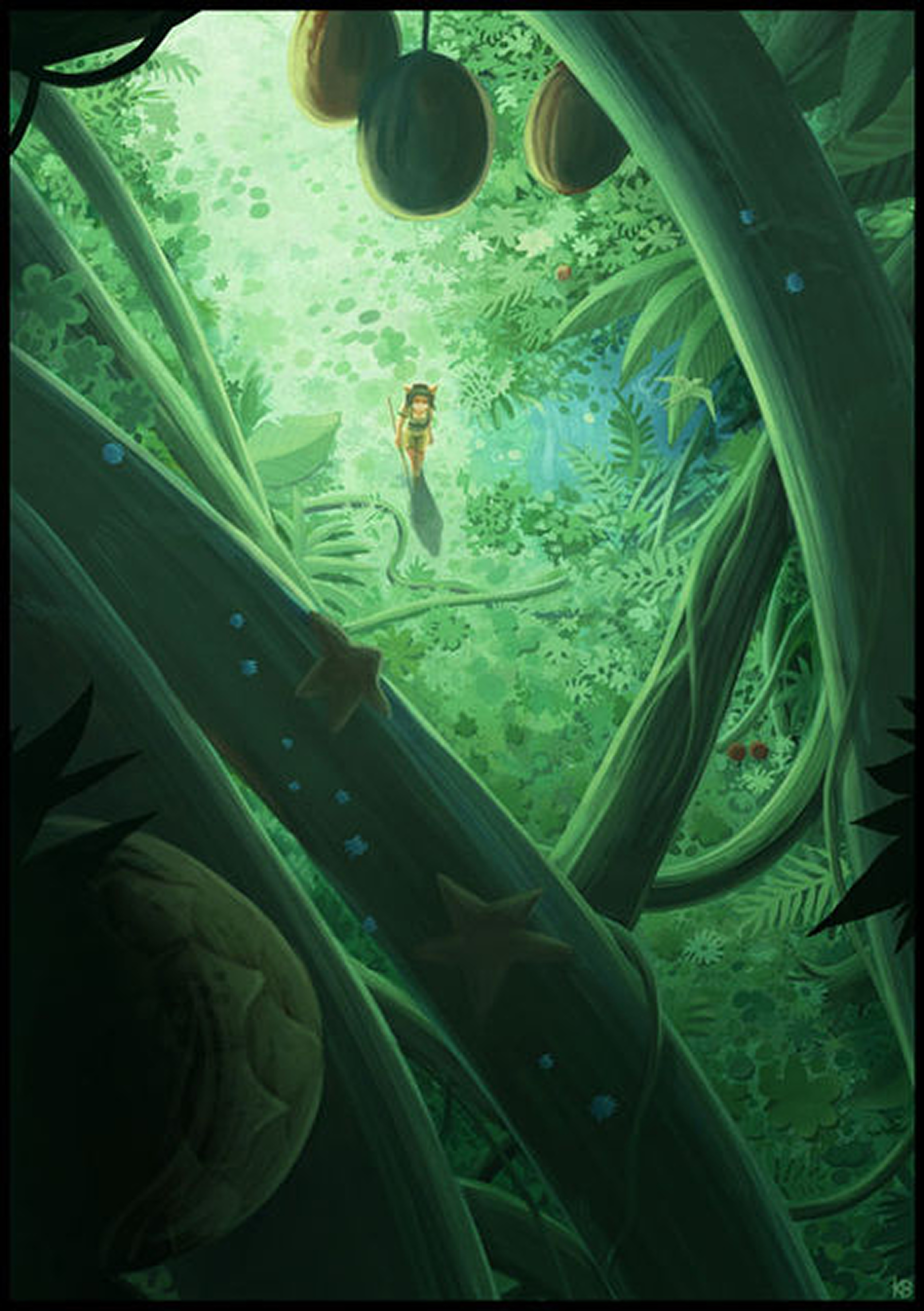 Tolmeshal forest is your typical Felaryan jungle. It's a beautiful and thick, lush jungle, teeming with life. The atmosphere is hot and humid. Some trees grow to truly gigantic size, dwarfing their surroundings, and stretching majestically toward the sky. It's common to see thick vegetation grow on these behemoths, even smaller trees sometimes! It's quite possible to navigate and find your way on their giant branches, hundreds of feet above the ground. You need a sure footing though, as the slightest slip can be fatal, and to watch out for canopy predators, such as arboreal frogs or pantaurs. The jungle floor is much more shadowy and damp and, while you don't risk falling to your death here, sometimes the vegetation will turn into an impenetrable wall of vines and poisonous creepers.