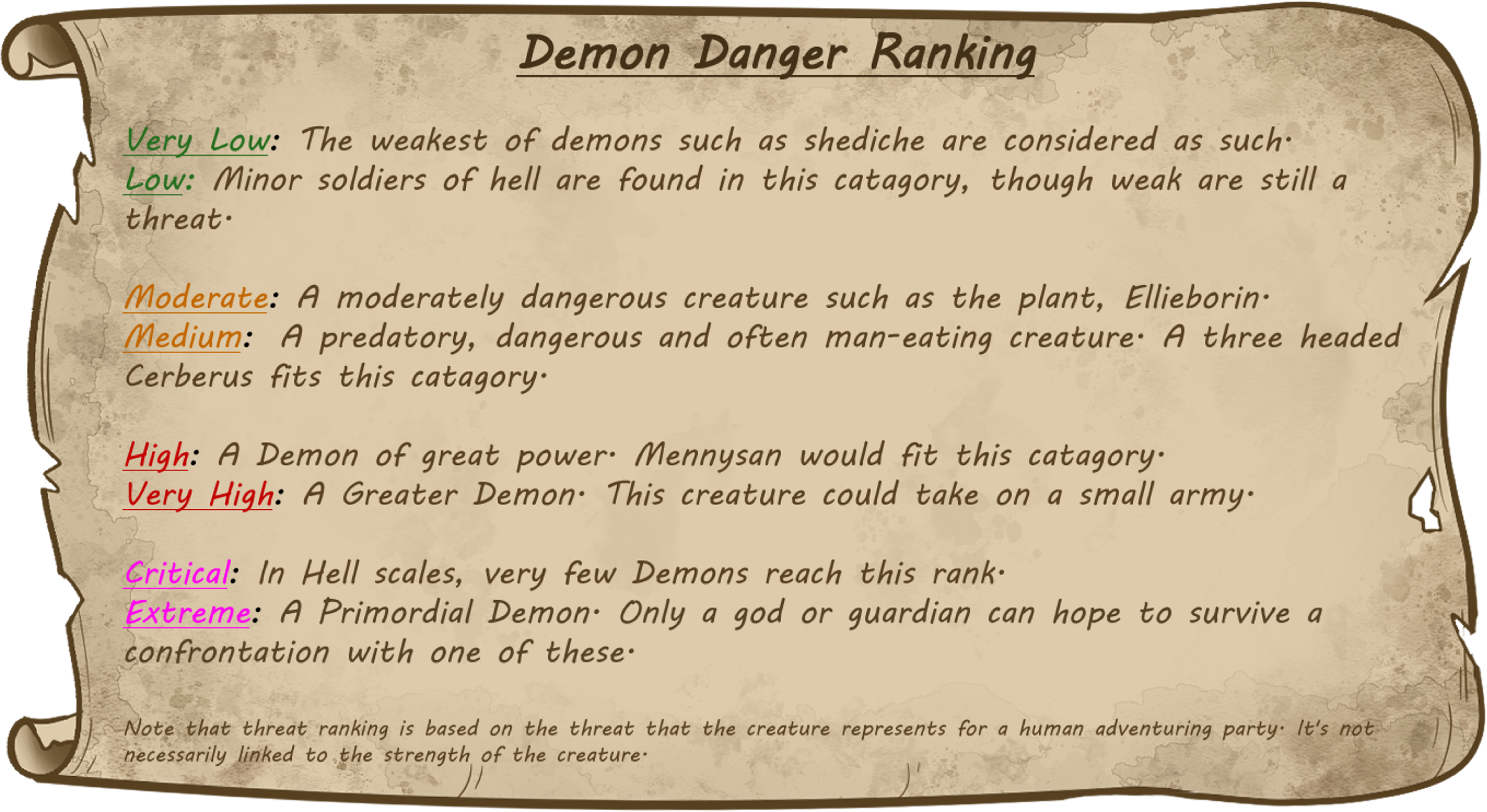 are, on average, strong and dangerous creatures, often possessing strange and deadly abilities, and they should always be engaged with the most extreme caution. Demons take numerous shapes, sometimes grotesque and bizarre, nightmarish and terrifying, or deceptively normal. They are often clever beings, and if they aren't, they more than make it up with their great strength. A demon alone could easily decimate a group of unprepared adventurers.